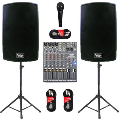 This set includes a pair of Podium Pro Audio's PP1502A powered speakers, a pair of PSS1 adjustable speaker stands, one MX1204 pro audio mixer, three X25 microphone / speaker cables and one Aud